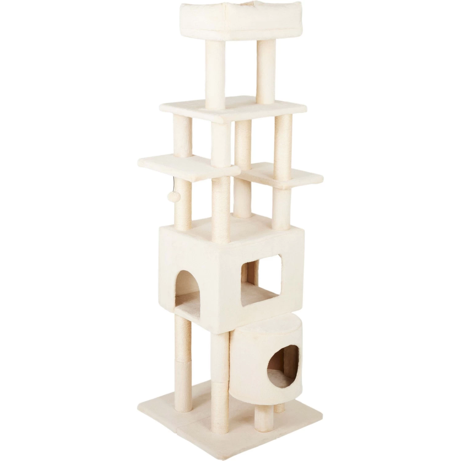 - Multi-tier cat tree featuring a top perch with a bolstered perch cover, eight partially wrapped sisal scratching posts, one regular condo and one extra roomy condo on the bottom.