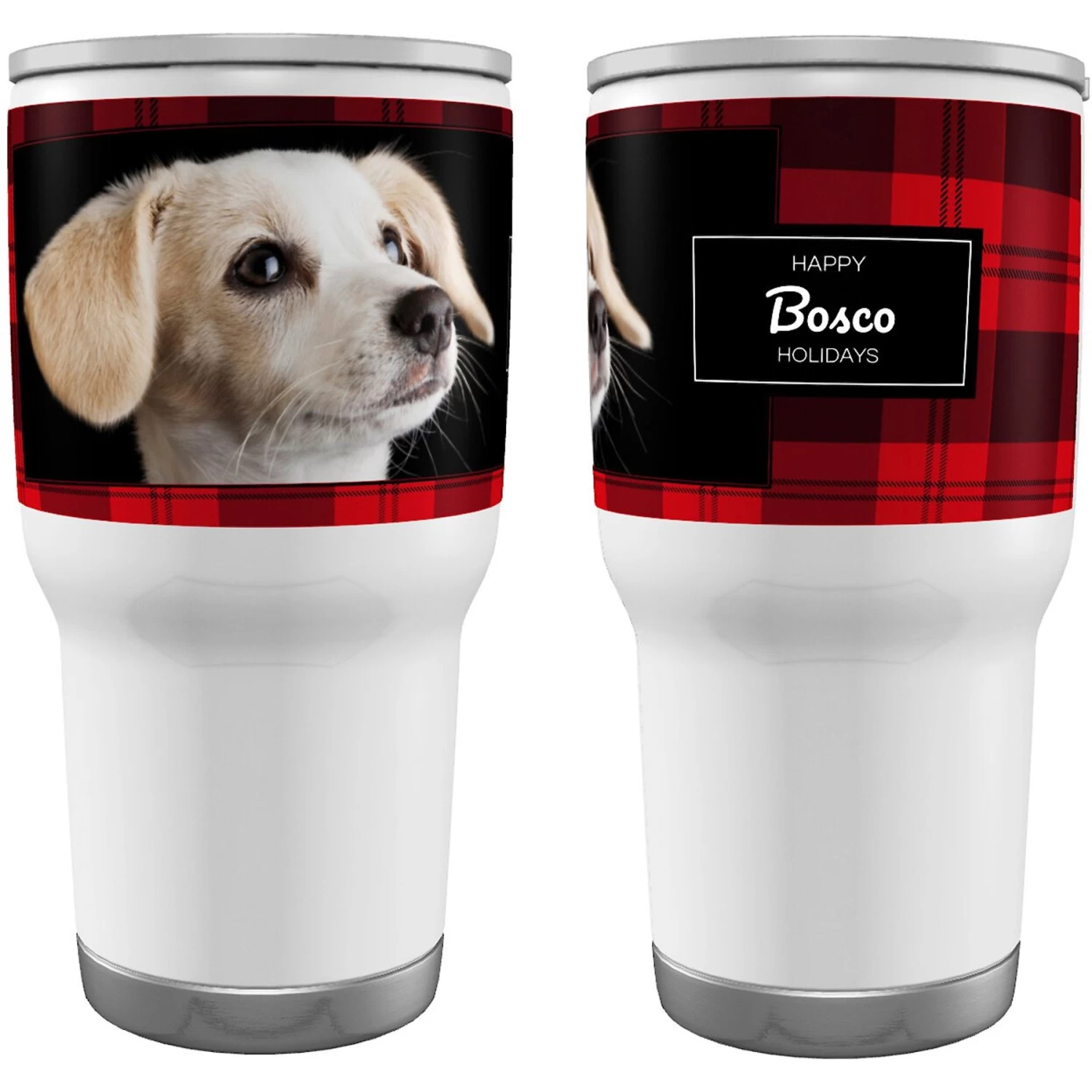 - Stainless steel, double-walled tumbler is customizable with your pet’s photo and personalized text.
