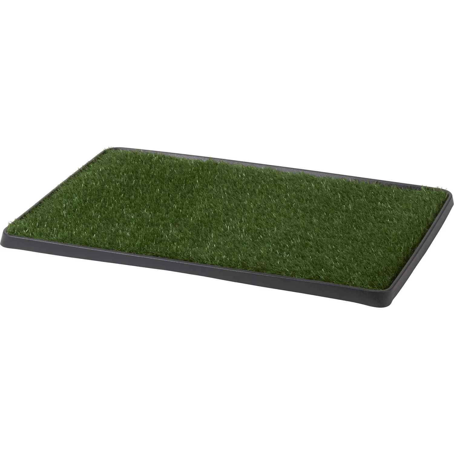 - The two-layered system consists of a faux grass mat and a plastic insert that allows liquid to drain into the included tray for easy cleanup.