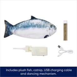 - Includes the plush fish body, a rechargeable battery pack, a USB charging cable and a tube of catnip.
