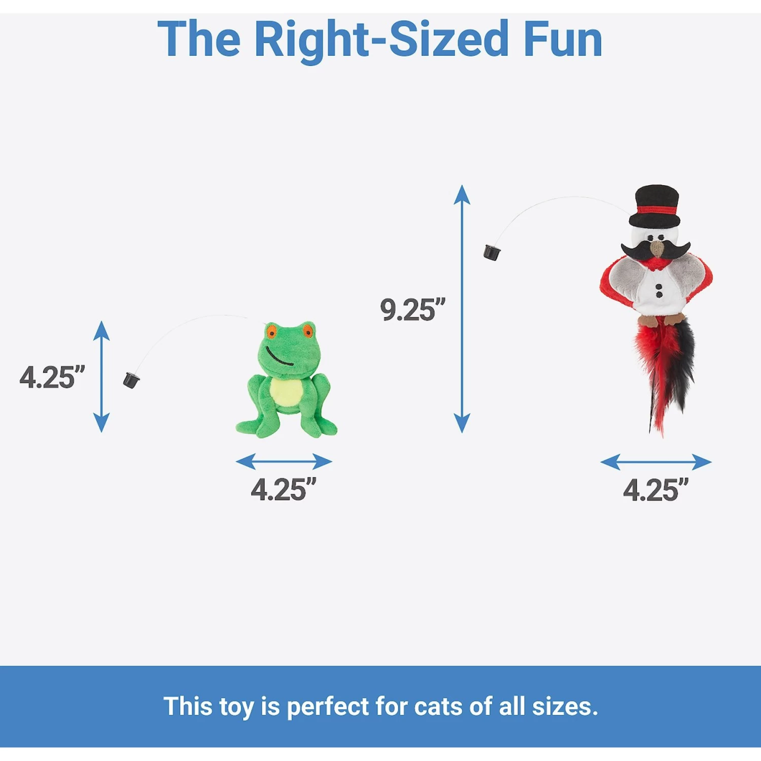 - Includes three-tier track, three colorful balls, and two interchangeable bouncy toys on top—a wizardly owl and frog.