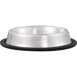 Serve up dinner in style with the Frisco Non-Skid Stainless Steel Pet Bowl. The smart design helps keep kibble in its place—in the bowl—and features a wide rubber base that keeps it from tipping, even if your pal is extra hungry. Stainless steel is stain-proof and easy to clean by hand or in the dishwasher. Plus, the adorable embossing adds a stylish touch.