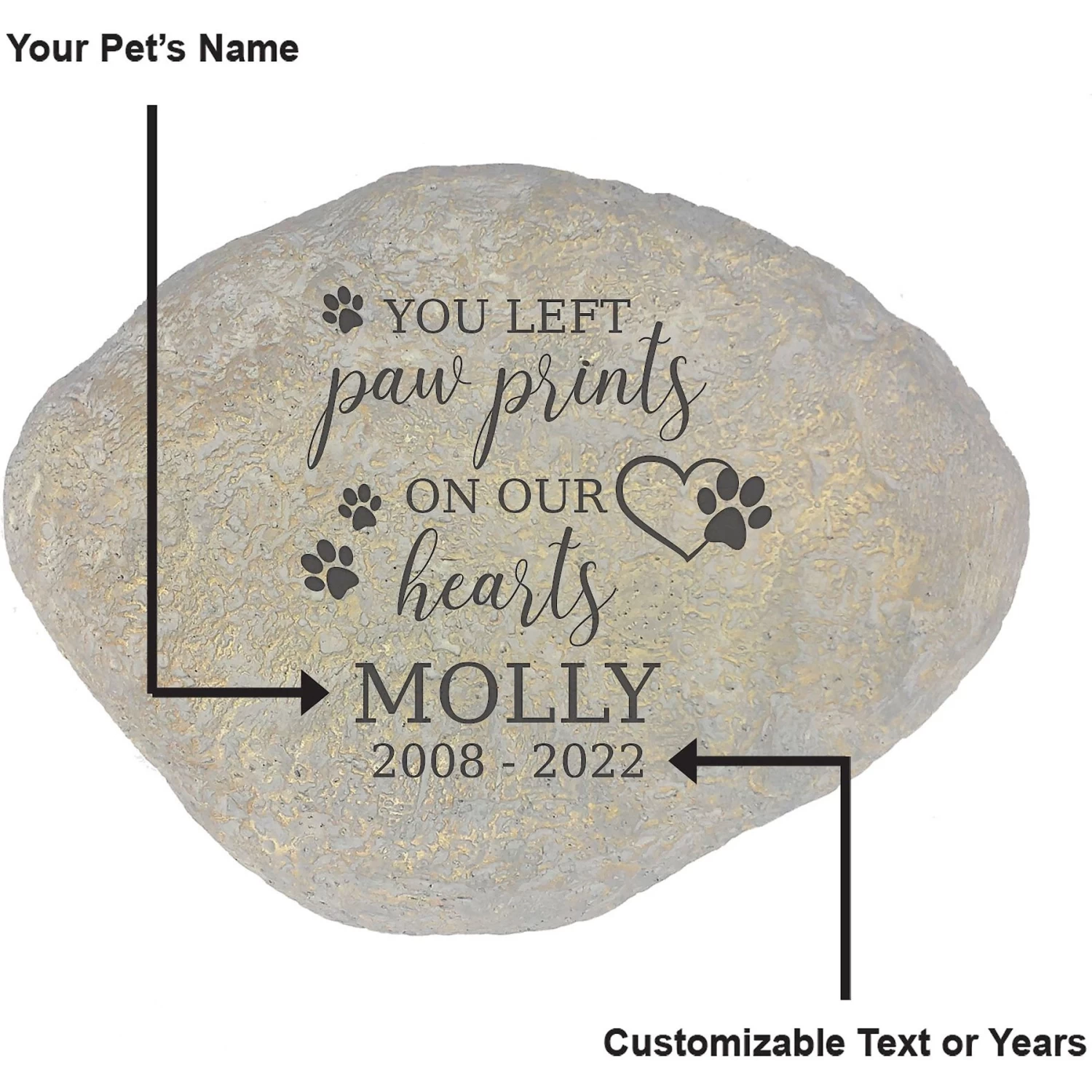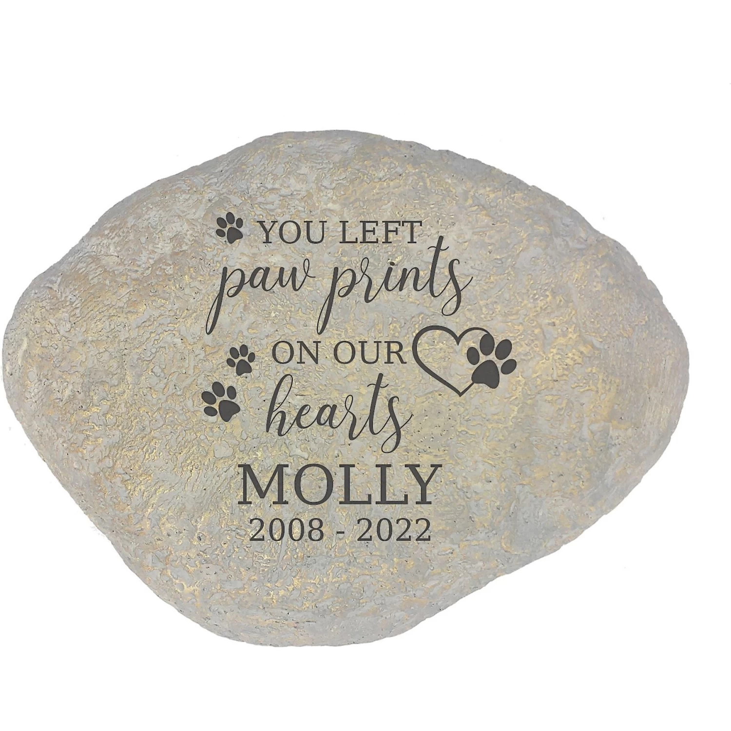 - Customize the stone with an engraving of your pet’s name and a date. Accompanying text says, “Paws on Our Hearts.”