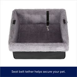 - The car seat is secured with two loops on the outside for the seatbelt, and an adjustable tether inside secures to your pet’s harness.